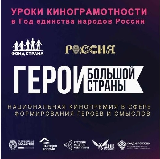 Национальная Кинопремия «Герои большой страны» в преддверии Праздника Весны и Труда и Дня Победы при поддержке Президентского фонда культурных инициатив, проектного офиса Года единства народов России, Национального центра «Россия» и Фонда развития культуры и кинематографии СТРАНА открывают образовательным учреждениям и организациям дополнительного образования доступ к «Урокам кинограмотности» с просмотром и обсуждением проектов шорт-листа Кинопремии.